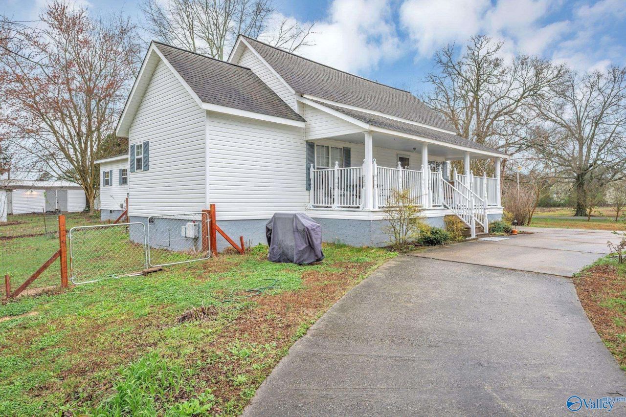 Country charm meets outdoor entertaining on this beautiful 2.6-acre property! This inviting home features a welcoming front porch, circular concrete drive, and a bright sunroom wrapping around half the house. Inside you'll find a functional layout with mud room, large laundry room, and butler's pantry. Step outside and enjoy the peaceful pond, perfect for fishing or relaxing evenings. A unique stage beside the pond creates the perfect setting for live music, gatherings, or outdoor entertaining. Additional features include a powered shop, detached garage with storage, and flat land with road frontage. Convenient to I-65 with easy access to Huntsville, Madison, and Cullman.